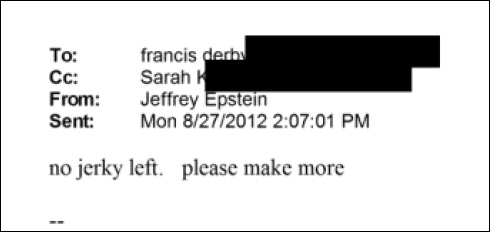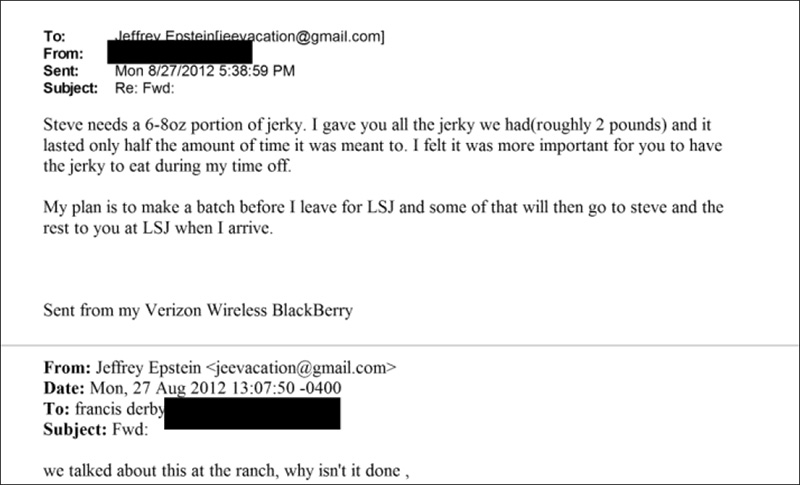 In another email, Epstein berates the chef again about jerky. Derby replies that Steve (the mogul mentioned above) NEEDS 6-8oz of the precious meat. He added that he did not expect Epstein to go through 2 lbs of it in record time. However, he will make more before going to LSJ (Little Saint James aka Pedo Island).