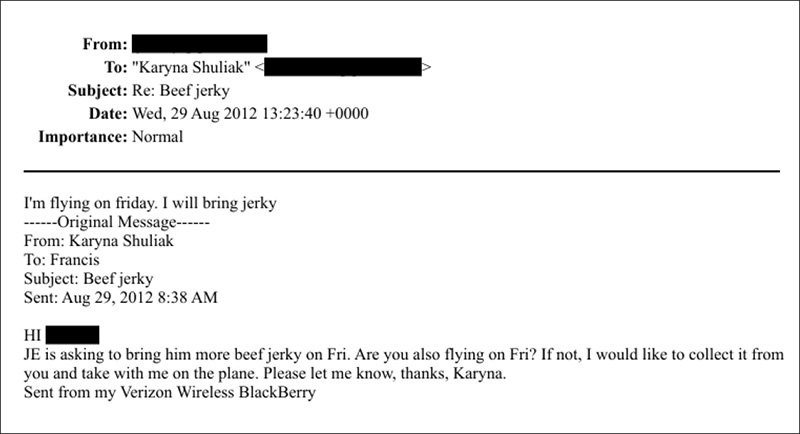 An email exchange between Epstein’s then-girlfriend Karyna Shuliak and a redacted person discusses obtaining beef jerky from a fridge and transporting it in an “insulated bag” with ice.