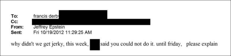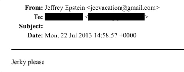 In this email exchange, a redacted person NEEDS to know if Epstein is out of jerky. The person who replies says, “He must be going through it like crazy.”