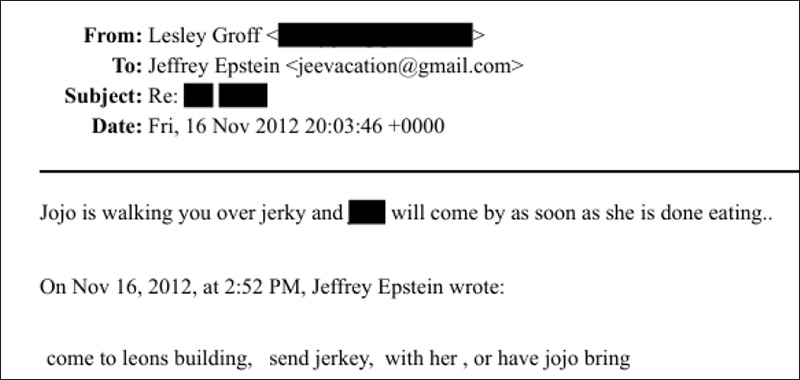 Picture this scenario. Leon Black is a private equity investor and the CEO of Apollo Global Management. His net worth is over $ 13 billion. Epstein is at his office, and there’s suddenly a jerky emergency. He wants his assistant, Leslie Groff (who is known to have orchestrated many of Epstein’s nefarious activities), to have someone personally “walk over” some … beef jerky. Why was so much care taken for this delivery?