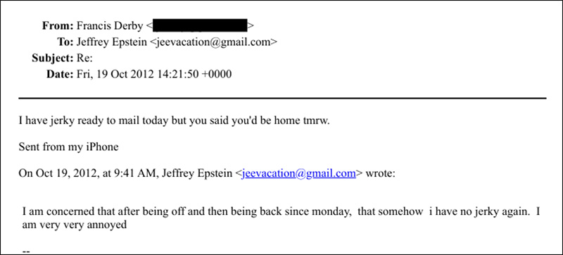 Epstein sends a message to Derby, saying that he is “very very annoyed” because “he has no jerky again.” Derby replies that he will mail him his precious jerky.